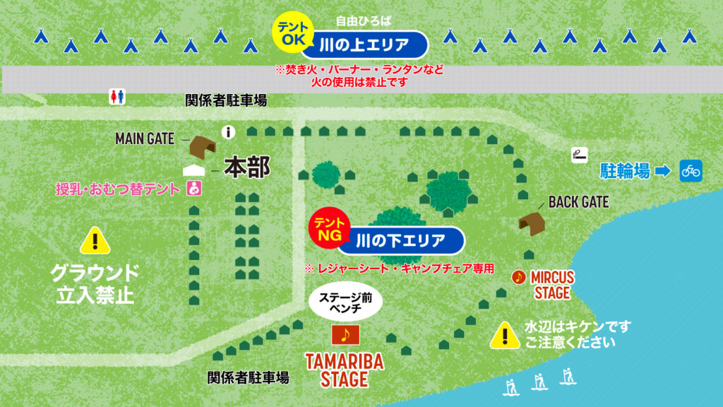 会場内の混雑緩和のため、今年度よりポップアップテントの設置は〈川の上エリア(自由ひろば)〉のみとさせていただきます。必要以上の場所取りはお控えいただき、譲り合って頂くようお願いします。