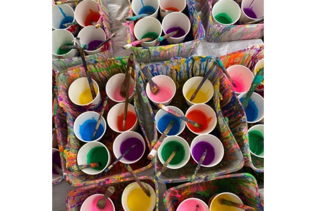「えのぐであそぼう・野外編」 白い布にえのぐを乗せ、混ざり合いや にじんで広がる世界を青空の下で楽しみましょう! えのぐをのせた布はお持ち帰りいただけます。 ・参加いただける年齢、2歳〜(えのぐを口に入れないこと) ・参加費、1500円 汚れてもいい服、タオルがあると安心です。