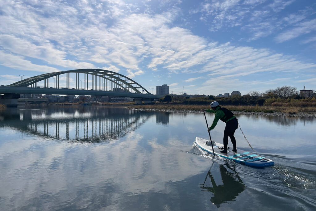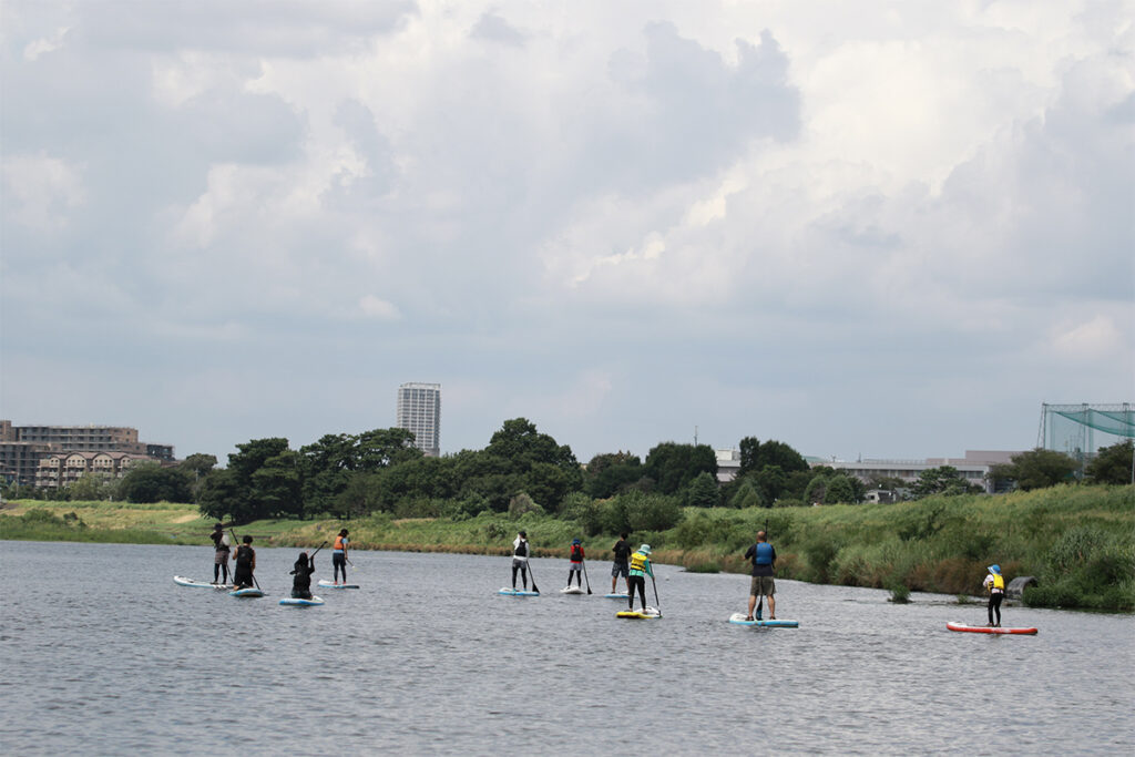 SUP体験で心も身体もリフレッシュ ! いつもの多摩川も、ボードの上からの景色はまた違って見えます ! 運動の後は食事も音楽も楽しめるのがTAMARIBAの大きな魅力です。